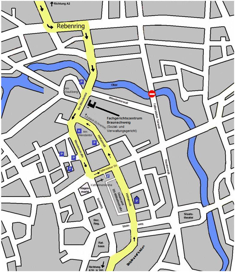 Wenn Sie über die Autobahn A 39 aus Richtung Salzgitter anreisen, fahren Sie am Dreieck Braunschweig-Südwest rechts auf die A 391 in Richtung Celle-Lüneburg-Braunschweig-Hannover. Folgen Sie der A 391 ca. 6,5 Kilometer bis zum "Autobahnkreuz Ölper Knoten" und nehmen Sie dort rechts die Ausfahrt "Zentrum / Celler Straße". Der Celler Straße folgen über Radeklint und Hagenmarkt; ca. 200 m nach der Katharinenkirche (am Hagenmarkt) an der nächsten Kreuzung links in die Wilhelmstraße einbiegen. Nach ca. 500 Metern liegt das Gerichtsgebäude auf der rechten Seite (vgl. Ausschnittsplan).