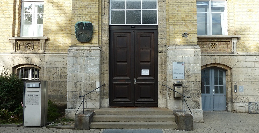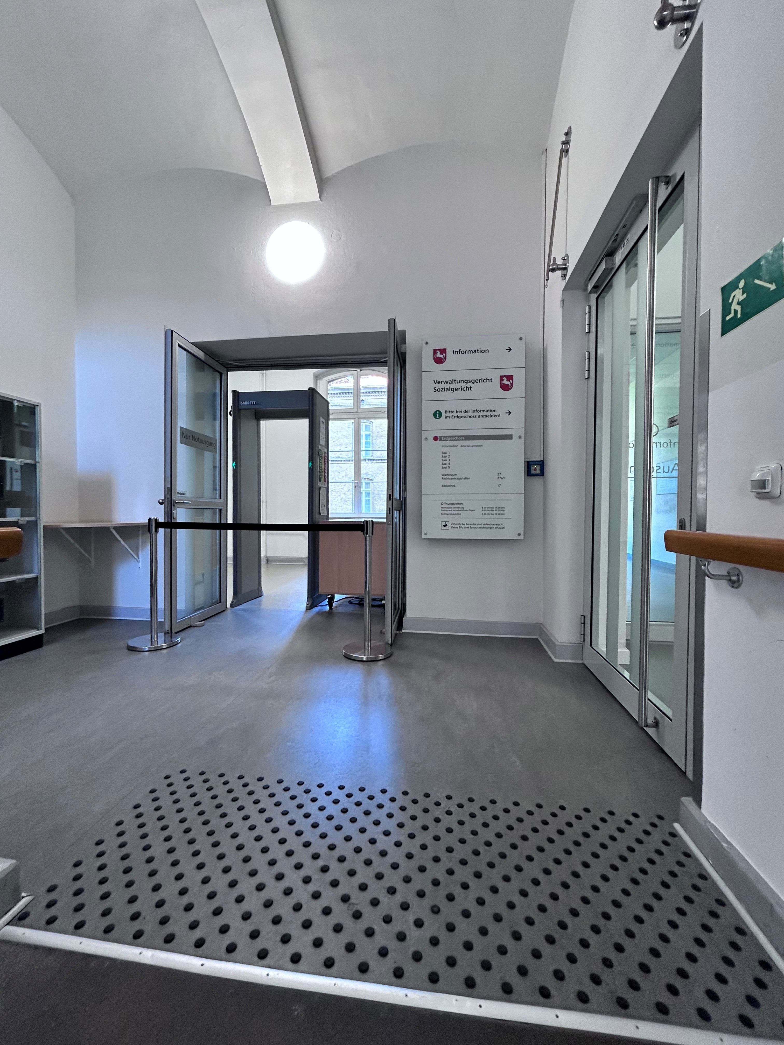 Eingangsbereich des Fachgerichtszentrums Braunschweig, in welchem das Sozialgericht Braunschweig und das Verwaltungsgericht Braunschweig gemeinsam untergebracht sind. Links ist der Fristbriefkasten, rechts der barrierefreie Eingang zu sehen.